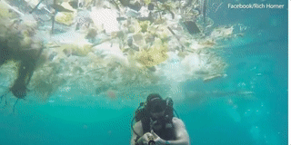 在巴厘岛附近的一片潜水海域,昔日纯净透亮的海水中,充斥着数不清的垃圾,其中大多是塑料制品。