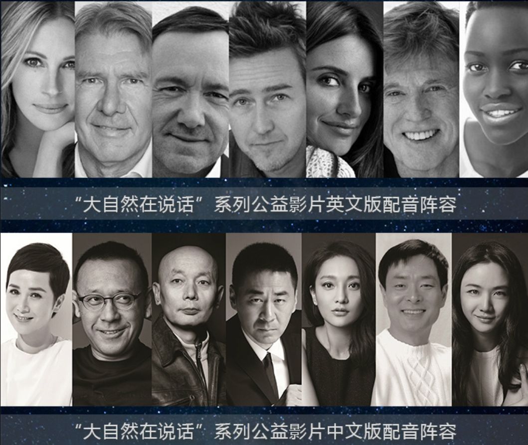由葛优、姜文、蒋雯丽、周迅、汤唯、陈建斌、濮存昕等七位知名演员分别为雨林、海洋、大自然、水、花、土地、红木等自然元素配音。