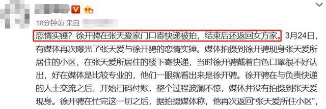 3月24号,有网友发帖询问“张天爱徐开骋,这都是第几波证明被发现在一起了”,帖中搬来媒体拍到的徐开骋在张天爱家门口寄快递照片,大家纷纷评论,感觉翻来覆去爆了好多次,只有粉丝在装瞎。