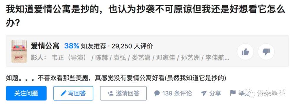 关于《爱情公寓》,有人在知乎上问过一个问题:我知道它是抄的,也认为抄袭不可原谅,但我还是好想看它怎么办?尽管观众的问责和质疑从未停止,但下面的高赞回答里不乏这样的声音:那就去看吧。