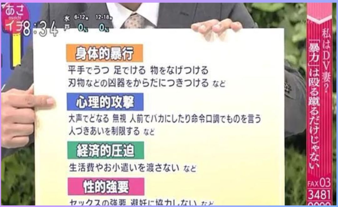 根据以往日本社会的男性遭遇的家暴事件,他们做出了一个家暴的行为分类:身体的暴行、心理的攻击、经济的压迫以及强行性生活。相比遭到妻子的语言、行为暴力,他们更多时候遭遇的都是来自精神和心理层面的家暴。