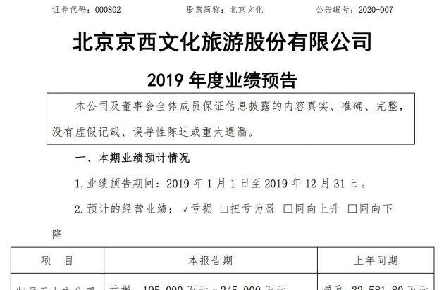 事实上,从《封神三部曲》背后的投资公司北京京西文化,在2020年1月30日晚间发布的一份2019年度业绩预告就可以看出,这家公司在2019年的全年预计亏损为19.5亿元至24.5亿元 ,而上年同期则盈利了3.26亿元。
