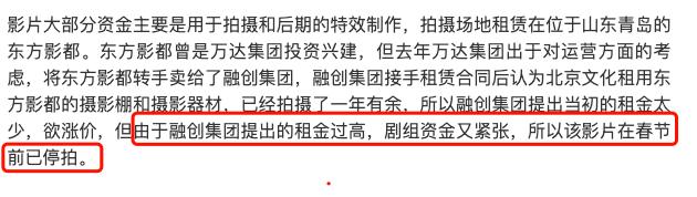 然而,从一部耗资30亿、立志要超过《指环王》的大制作电影,竟然只是因为拍摄场地东方影都提出租金涨价,就直接导致了整部电影的停拍,甚至是被“赶出”了青岛的拍摄场地,就不难看出其背后团队或许真的是遇上了资金周转困难的问题。