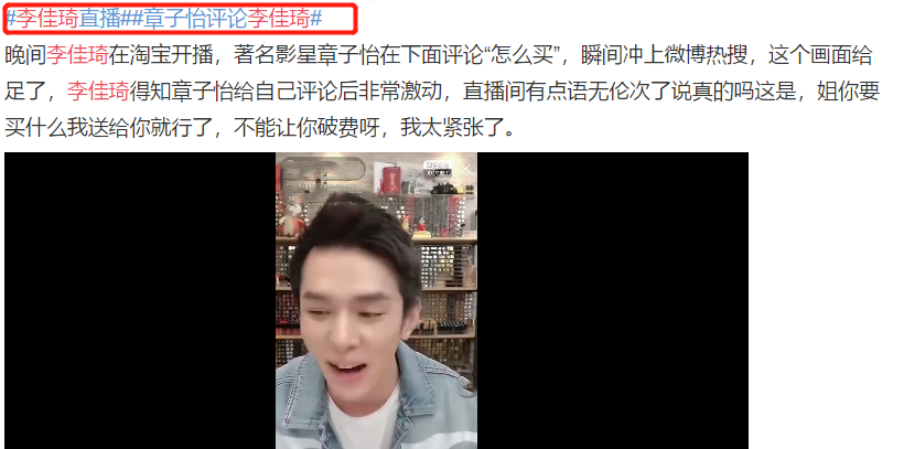 直播时,李佳琦得知自己获得了章子怡的评论后,惊觉女神可能在看自己的直播,又激动又紧张,语无伦次,脸都红了,连说了好几声“新年快乐”,粉丝都表示这样的佳琦哥哥太可爱了。