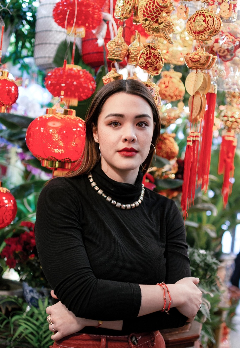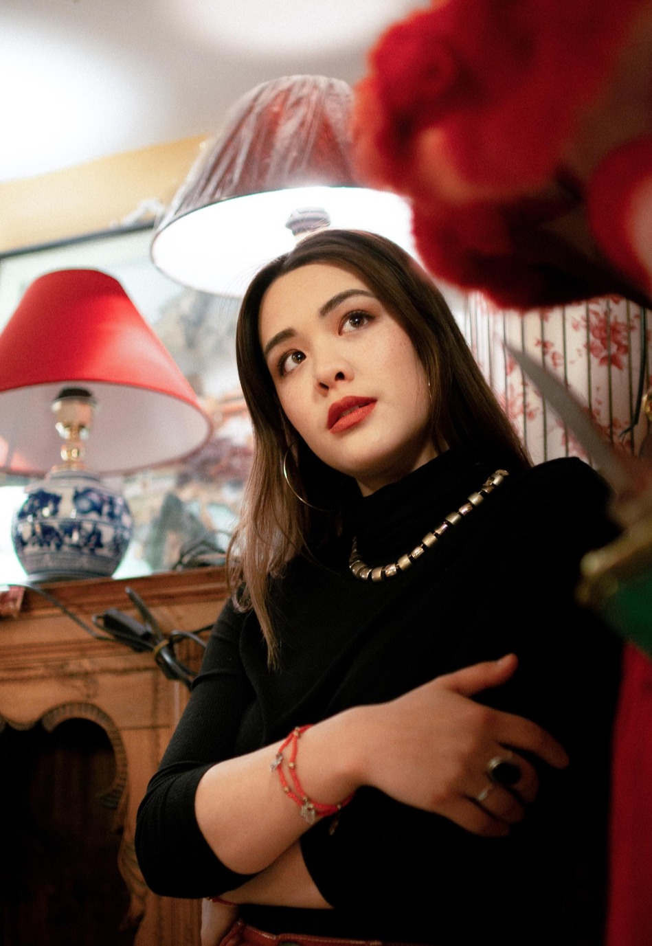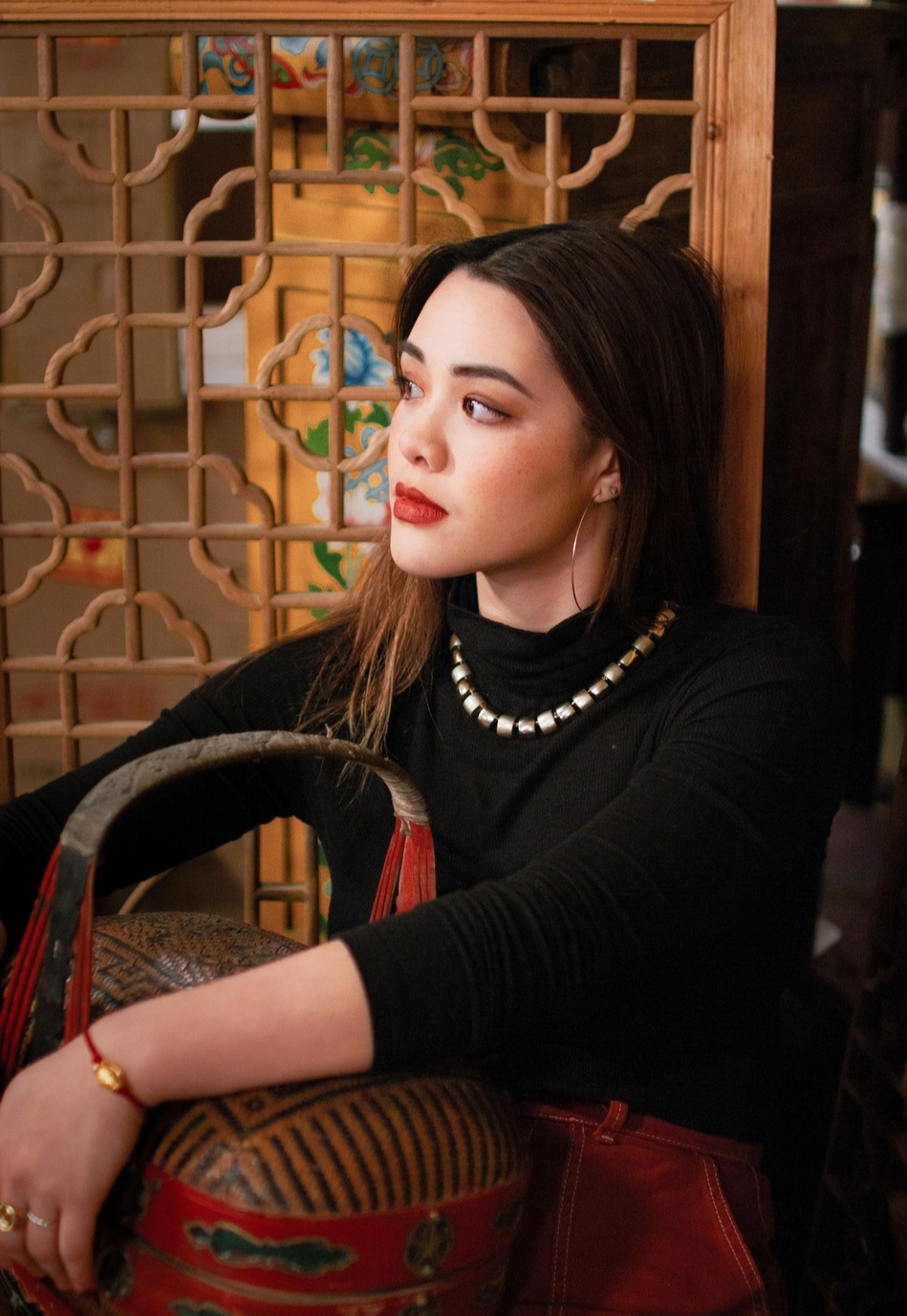 在中式背景下拗造型,抱着木质篮子的Yasmine侧对镜头,金属配饰十分抢镜。