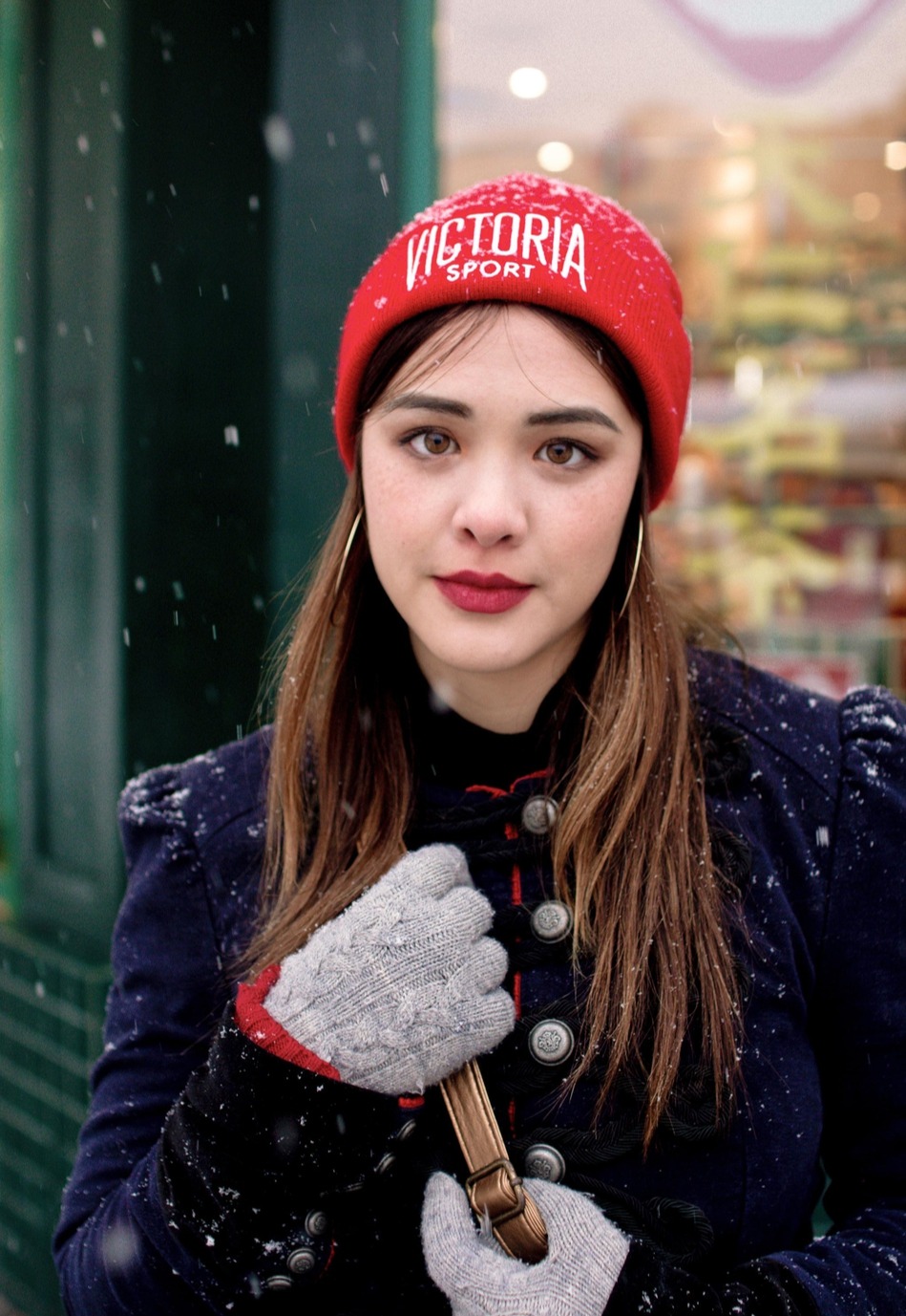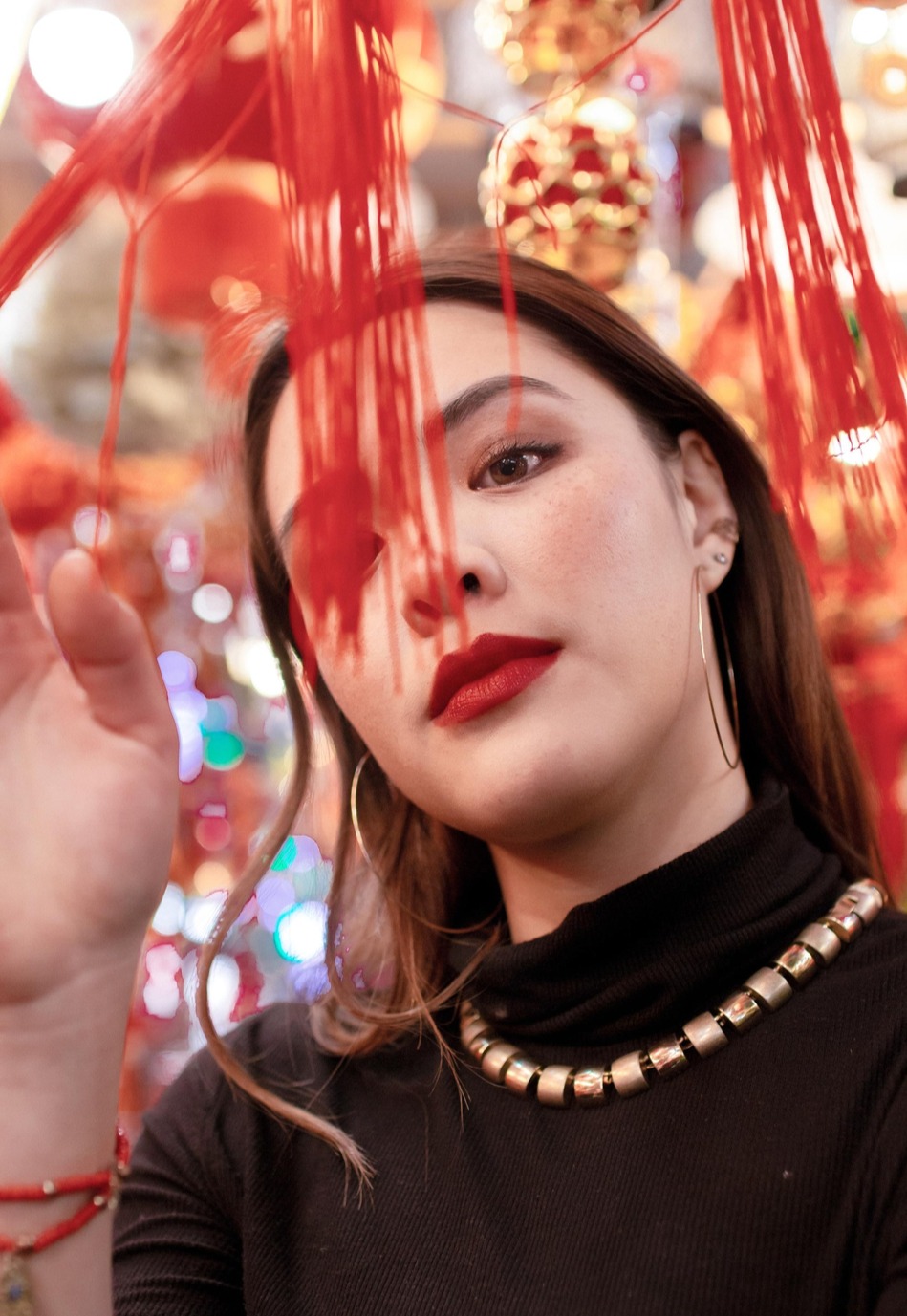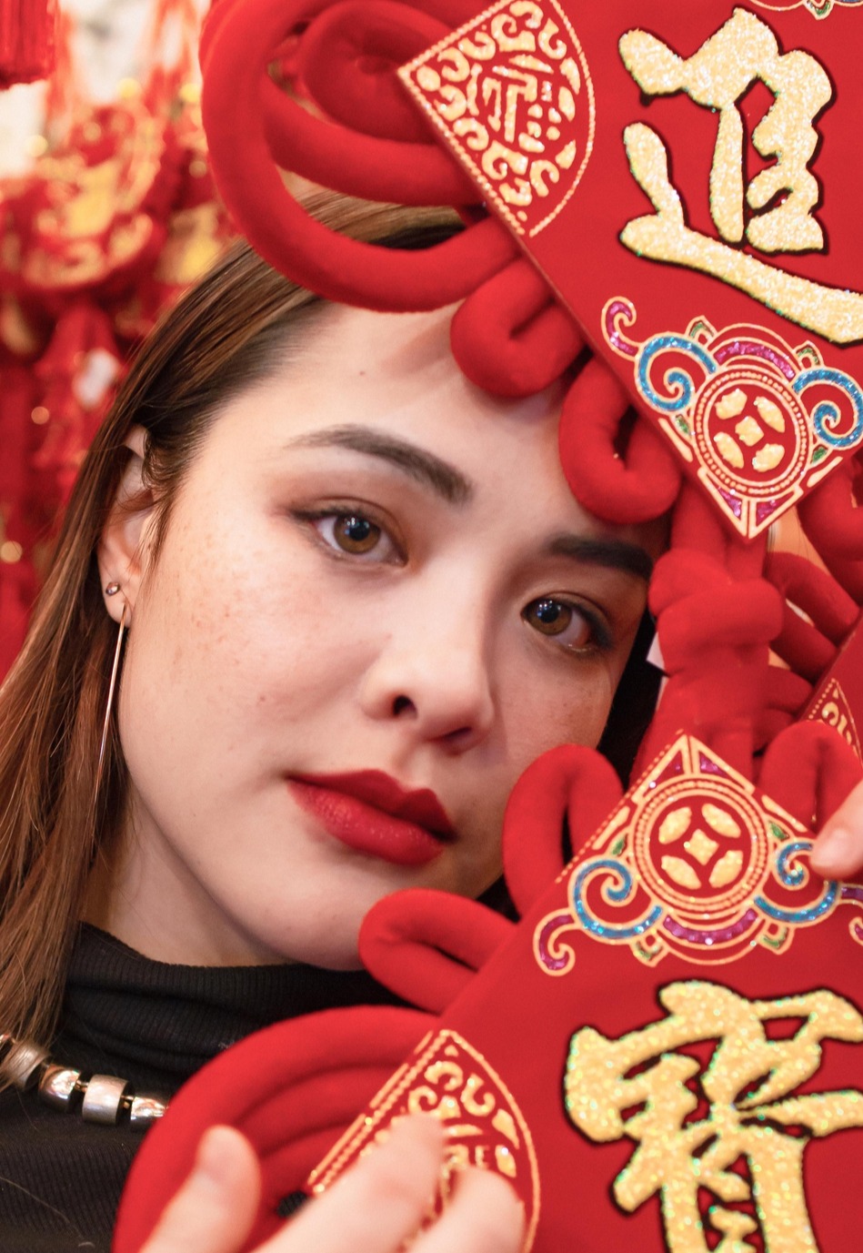 在中式背景下拗造型,抱着木质篮子的Yasmine侧对镜头,金属配饰十分抢镜。