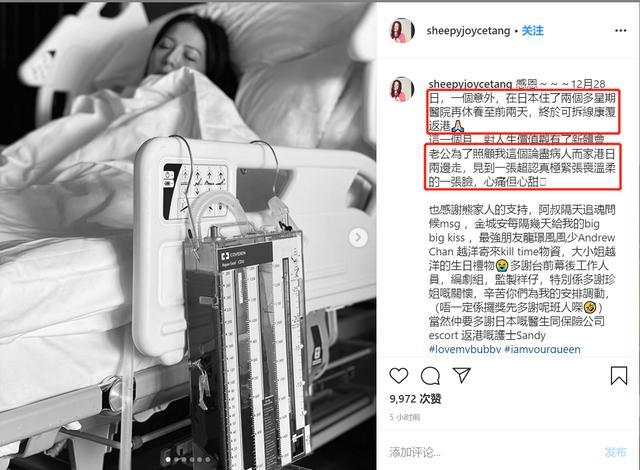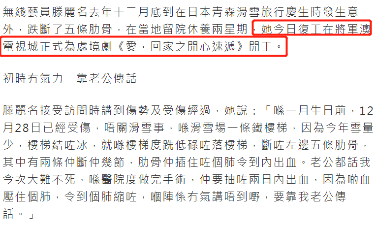 滕丽名在去年12月底,因为在日本滑雪出现意外,不慎摔断了5条肋骨,当时情况还是比较危急的,不过在日本的连续治疗,加上有老公的贴身照料,情况已经有了好转。