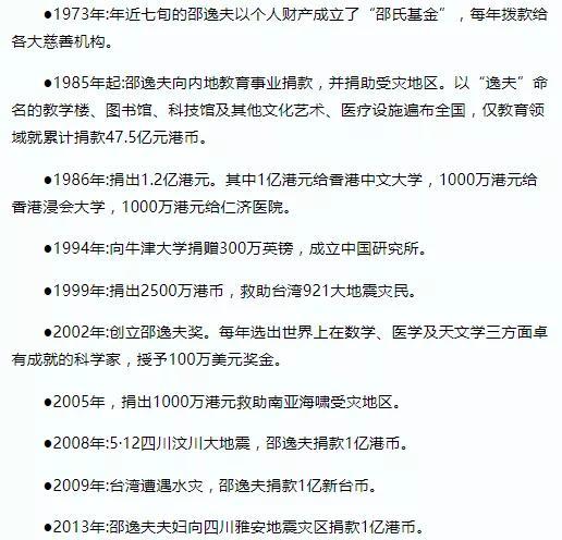 多年来,邵逸夫为社会公益捐助超过100亿港元,尤其重视对教育科学事业的投入。全国多家高校均有以他名字命名的“逸夫楼”,此外,他还成立了有“东方诺贝尔”之称的“邵逸夫奖”,以此来表彰对科学事业有突出贡献的人才。曾经连20块馒头钱都要斤斤计较的邵逸夫,最终成为了有口皆碑的大慈善家。