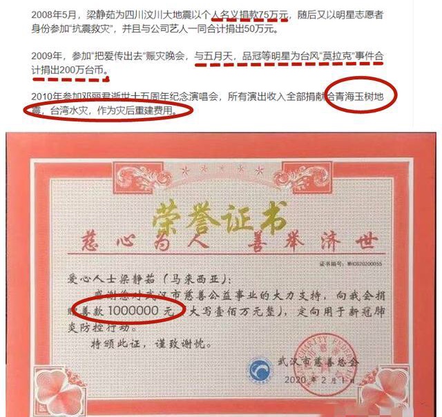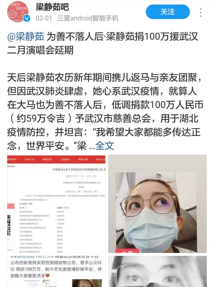 梁静茹虽是马来西亚籍,但对于武汉的疫情十分关注。她以个人名义通过武汉市慈善总会捐款100万元人民币用于湖北疫情防控。将原本定于本月14、15号在上海举行的“202020当我们谈论爱情”的首场巡回演唱会延期。