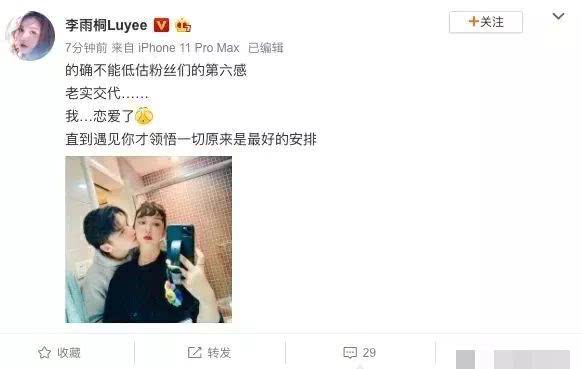 网友们这才刚提出建议,就已经有人交作业了!2月5日,李雨桐发微博表示:“的确不能低估粉丝们的第六感,老实交代,我恋爱了!直到遇见你才领悟一切原来是最好的安排。”并晒出了她和男朋友的接吻照。