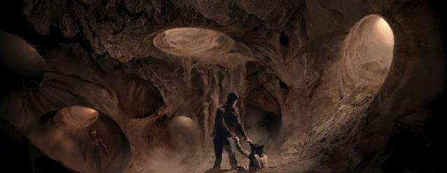 《星球大战9:天行者崛起》中,不同行星的地貌特征也是影迷们讨论的热点。设计图里有一张地下洞穴图,主人公陷入流沙后掉进这些洞中,不远处,还能看到机器人的身影。