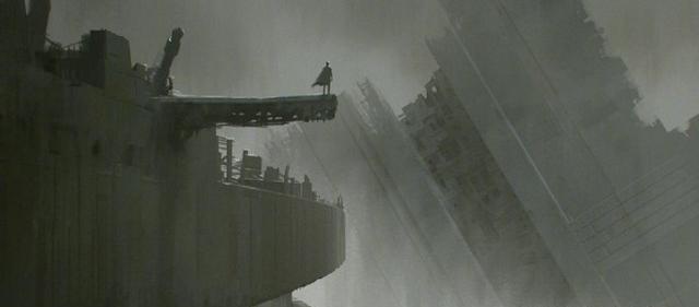作为《星球大战》中最厉害的武器,死星上安装有能摧毁整个行星的超级激光炮。在死星毁灭后,巨大的残害散布在海面上。一位片中角色站在残骸上,眺望远处。