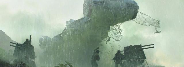 反抗军势力在概念图中也有展现,几位战士在瓢泼大雨中坚守炮台,不远处的飞船上还铺设有伪装网,使其看起来能与周围的自然环境融为一体。