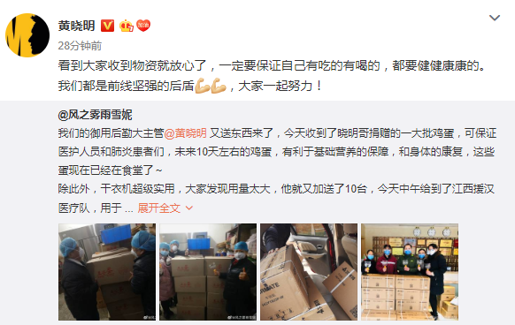 武汉一线医护人员发文表示:“感觉每天的吃喝用都被细心的晓明哥安排的明明白白,大家都觉得好幸福呀”。时隔不久,黄晓明转发并回应:“看到大家收到物资就放心了,一定要保证自己有吃的有喝的,都要健健康康的。我们都是前线坚强的后盾,大家一起努力!”