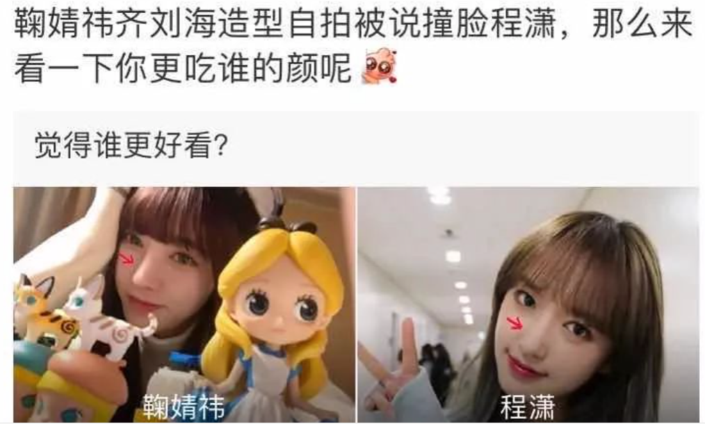 是不是觉得辣眼睛?可近年来的流量爱豆曝光自己的方式多是如此。先用高p图四处宣扬自己的美貌,时不时也可碰瓷艳压一下。鞠婧祎发了自拍,都说像程潇,鞠婧祎的鼻梁怎么又变了。