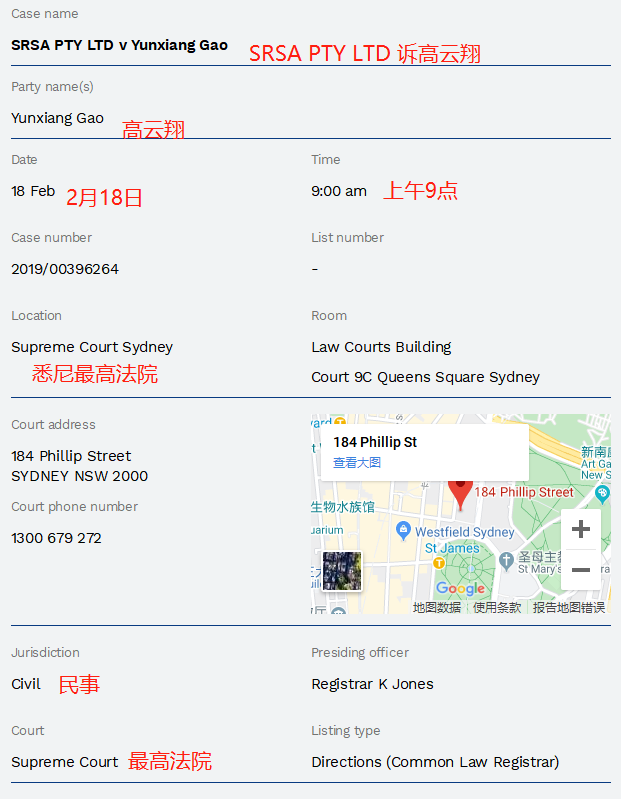 另外,就在前几天,新南威尔士州法院官网还更新了关于高云翔的另外一则庭审信息,起诉他的并非是性侵案女当事人,也不是英国女王,而是一家叫做SRSA PTY LTD的公司,开庭时间为2月18日当地时间上午9点。诉讼类型是民事诉讼,开庭时间是2月18日上午9点,起诉原因未知,不知是不是高云翔在澳洲又摊上了新官司。