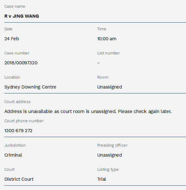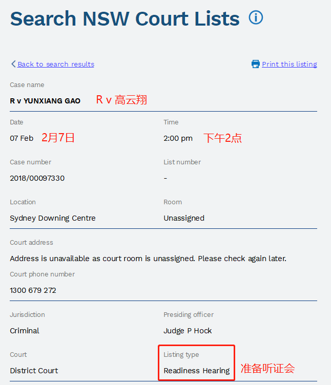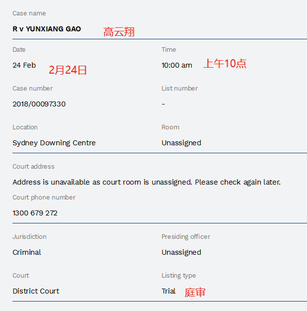 2月5日,新南威尔士州法院官网公开了高云翔王晶的最新开庭信息:2月24日上午10点,开庭地点是地方法院。这和去年的说法是一致的,并不像某些媒体报道中所说的“取消重审”