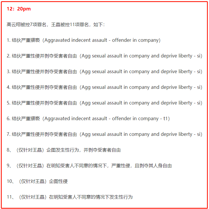 高云翔共受到包括结伙严重猥亵和结伙严重性侵在内的共7项指控,王晶受到的指控在高云翔7项罪名基础上,还额外多了4项,共计11项指控。历次庭审中,两人均不认罪,并辩称是女当事人自愿与他们发生关系。