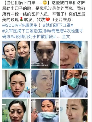因为每天戴口罩穿防护服,很多医护人员的脸被勒出了印子甚至伤痕。