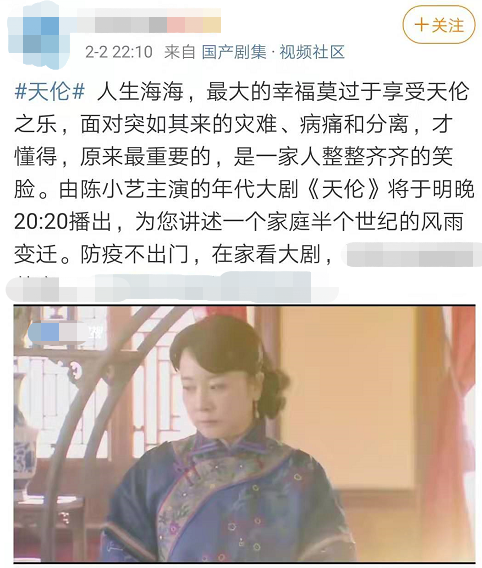 2月2日,有电视台宣布将再次播出陈小艺2016年播出过的年代电视剧《天伦》。