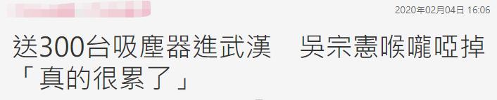 2月4号,台湾媒体报道称,吴宗宪直播中自曝他已经捐出了300台自己投资销售的吸尘器到湖北省,希望帮助武汉度过难关。