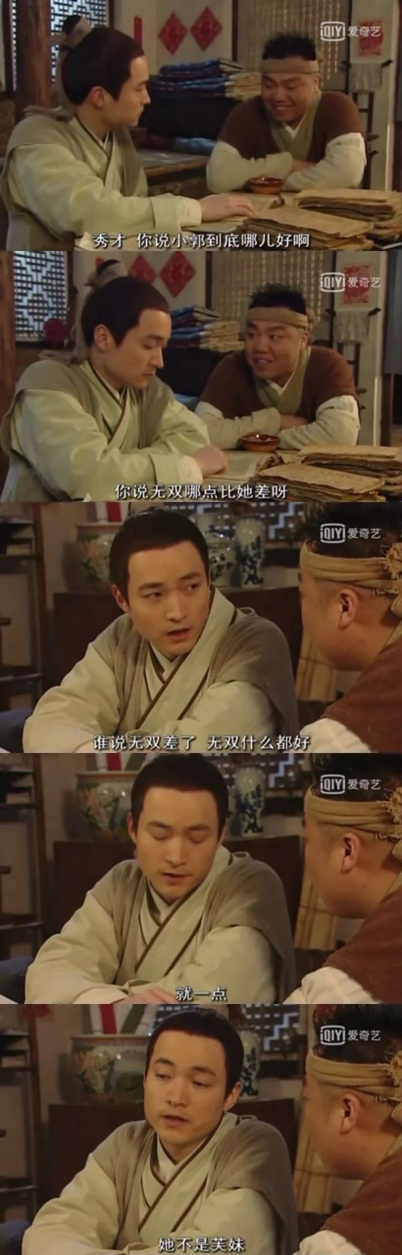 同样的爱情也发生在了,吕秀才和郭芙蓉身上。 第30回,郭芙蓉回家探父母。这时,七侠镇来了一位秀外慧中,才貌双全,武艺高强,并善解人意的新朋友,她就是白展堂的师妹祝无双。 因为个中误会,无双慢慢有点喜欢上了秀才。就在所有人看来,无双都比小郭好时,秀才却无动于衷。 大嘴问他:“你说小郭到底哪儿好啊,无双哪点比她差。”