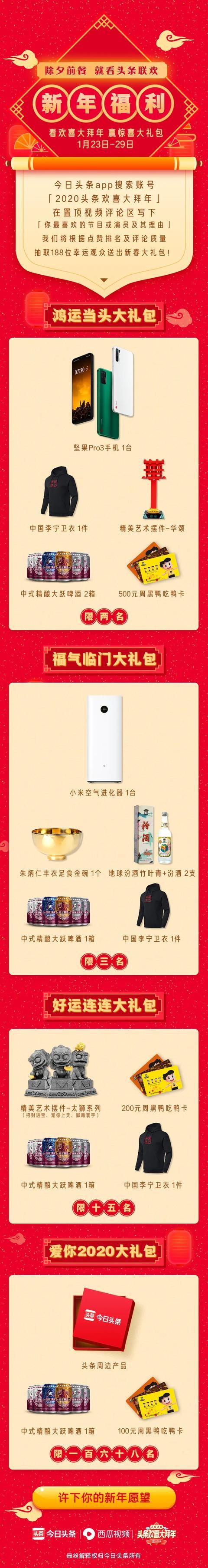 当然啦,除了精彩好看的节目让人眼花缭乱,还有数不清的福利让人拿奖拿到手软。只要看视频去评论区留言,写下最喜欢的节目或演员及其理由,就有机会获得新春大礼包,名额足足有一百八十八位!心动了吗?还不快前去今日头条&西瓜视频《2020头条欢喜大拜年》围观!