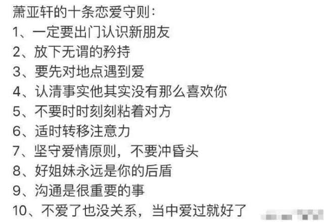 这是什么样的境界?看看萧亚轩恋爱十条准则中的最后一条:不爱了也没关系,当中爱过就好了。这是多么豁达又潇洒的态度。爱情来的时候,认真投入;爱情消失的时候,拿得起放得下。如果大家都能像萧亚轩一样的恋爱心态,大概世间也不会有那么多的痴男怨女。
