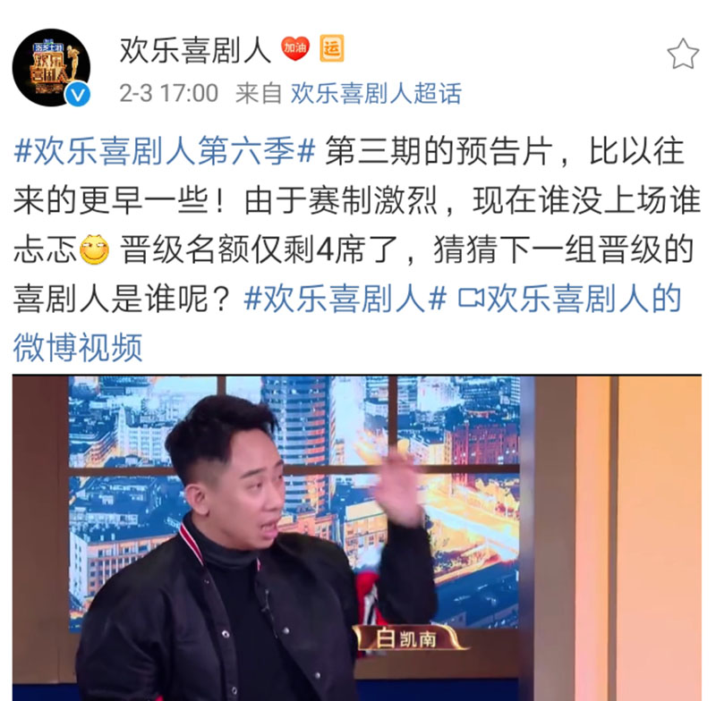 或许是太着急了,或许是想给窝在家里不能出门的观众们一个希望,《欢乐喜剧人6》在第二期播放完后,于2月3日当天就放出了第三期的预告片,结果却出现了错