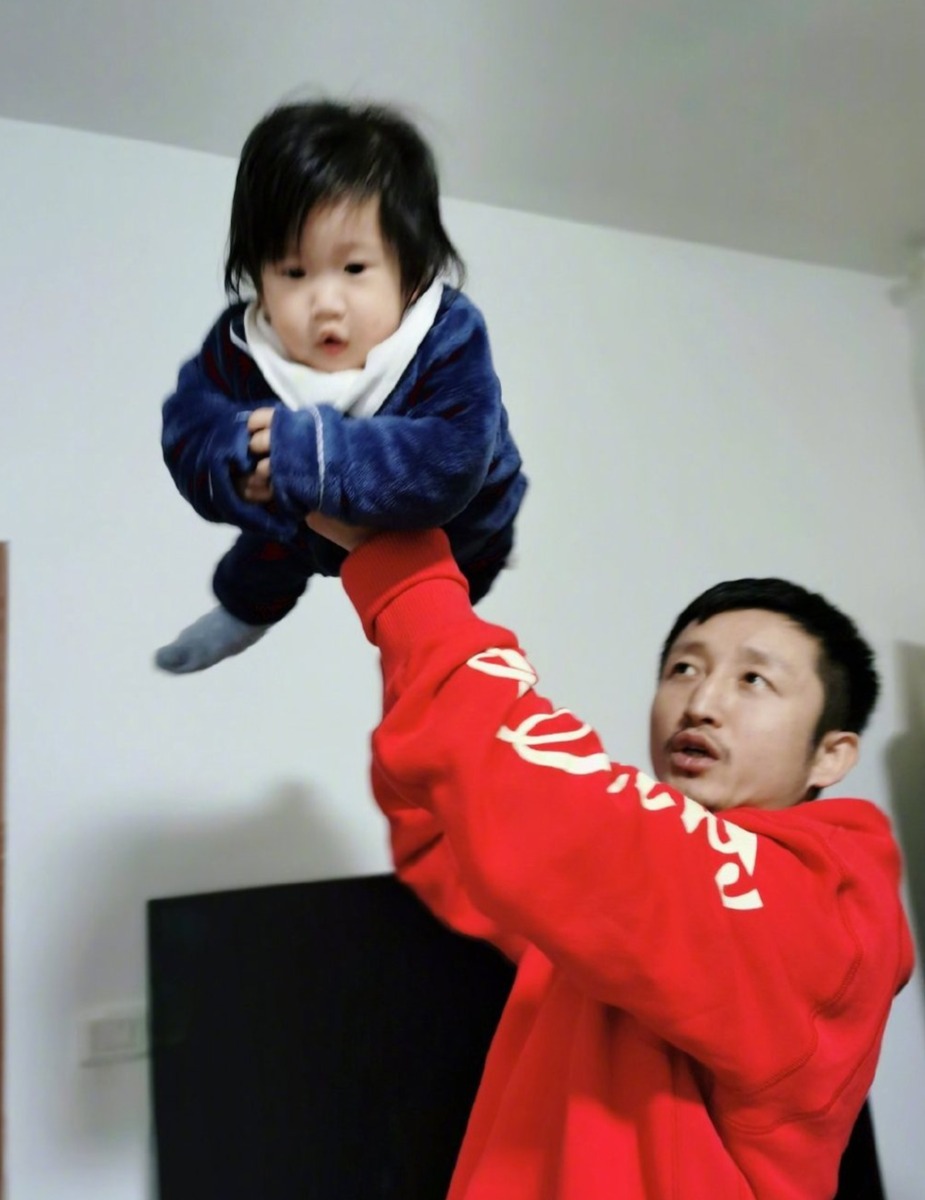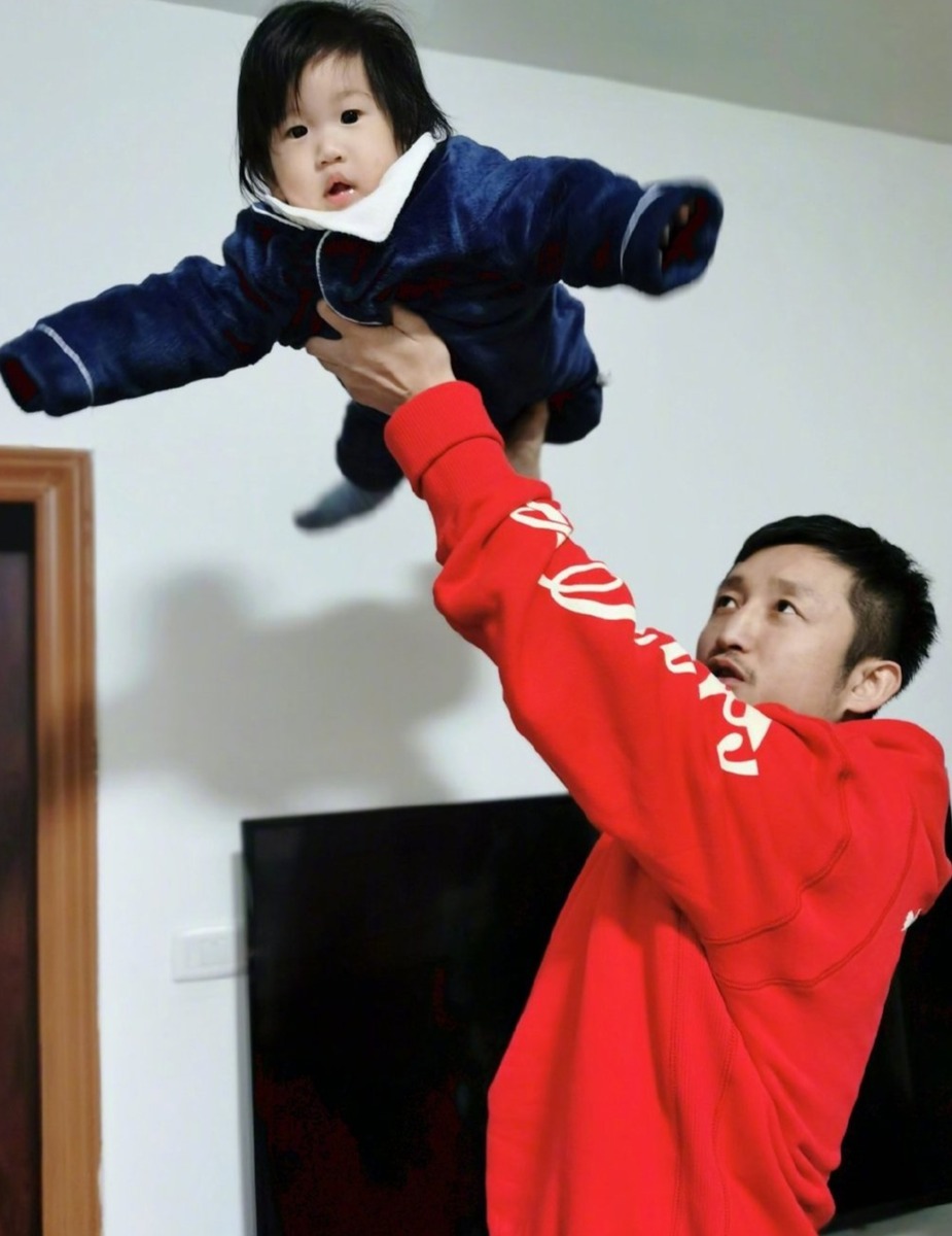 照片中,邹市明双手托举着女儿,女儿则展开双臂做飞行状,父女同框温馨。