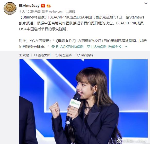 1月31日,发布韩星资讯的微博账号@韩国Me2day称,《青春有你2》的导师Lisa因肺炎疫情停止录制返回韩国,网友哗然“导师跑路”。硬糖君查阅了相关消息及YG公司的声明,Lisa是因节目组录制推迟而返回韩国,倒并非退出节目。