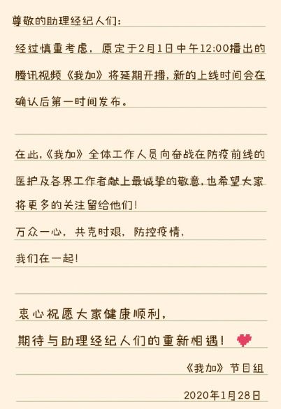 除卫视综艺外,优爱腾的网综也同样受到限播政策的影响。腾讯视频原定于2月1日播出的互动综艺《我加》在1月28日宣布延期播出,且播出时间未定;爱奇艺的女团选秀《青春有你2》和优酷的男团选秀《少年之名》(《以团之名》改名),原本都以开年综艺在做预热。《青春有你2》不止是导师频上热搜,连选手宣传都已经铺开。如今乐观估计,应该要相约暑期档了。