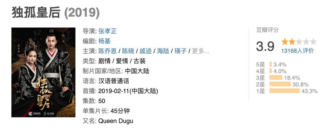 2019年,原来我看了那么多IP改编剧! 观众圈子里可能有个不成文的规定,对日剧韩剧的滤镜大于国产,而在国产剧里,网剧的滤镜又大于上星。 但今年的网剧惨淡到什么程度呢?惨淡到不管是先网后台,还是上星兼有网络平台大力扶持,还是单纯网络平台……成绩都是just许凯(soso)。 IP剧、翻拍剧、甜宠剧全靠批发? 一开年,陈乔恩和陈晓的《独孤皇后》就给大家来了一记低分示范。 剧情玛丽苏,主角光环过重,服化道廉价……但有网友认为,最大槽点还是陈乔恩年过40仍在玛丽苏剧里演少女。 对此陈乔恩猛怼网友,还发出灵魂拷问:“女演员的价值只是让你看到岁数吗?”——为贵圈提供了可以争论一年的话题,大概是《独孤皇后》最大的贡献。 年初大制扑了,接踵而来的是各种翻拍剧和甜宠剧。2018年的翻拍剧清单大家感受一下↓ 这还只是2018年的翻拍剧,2019的还没算上呢…… 然而2019年能上线的翻拍剧不多,大家比较有印象的应该是《新白娘子传奇》和《倚天屠龙记》,倒不算太雷人,画面还挺美。 可正因为过于追求颜值和画面美,这些新武侠偶像剧显得没有灵魂,新《倚天》里一众美眉看下来,最具辨识度的依然是周海媚的灭绝师太。 但是周海媚在这剧里也被嘲了 甜宠剧这边,倒是圈粉圈得轻轻松松。 《致我们暖暖的小时光》甜得来又真实,开分破8,后来掉到7.9,表现不错。 超高甜的《东宫》也有7.6分。这剧更骚,在《新白》《倚天》夹击下,突然……下架了。看了一半的粉丝纷纷表示抗议,路人也进来围观,于是重新上架后,大家围观围观着发现,真甜真香。 更神奇的是,这剧最近还上!星!了!下架又上星的操作不明觉厉,东宫女孩恐成最大赢家。 而这俩没破8的甜宠剧加上《锦衣之下》,都算是同类型里的口碑资优生了;更多剧谈不上好不好,单剧名列在一起就很……疼痛文学,令人头大。 这还只是一小部分 这么多记不住名的翻拍剧、甜宠剧,要说为贵圈有什么贡献的话……倒是很多剧中演员都乱入了几大演员节目,节目话题比作品还高。 比如压着新《神雕侠侣》没播的毛晓慧都刷了个脸熟 关掉剧透和弹幕也无法挽救的“高品质剧” 当你畅游在原著党和新观众的夹缝里,屏蔽掉某些关键字,关掉了弹幕,好不容易找到一部不必开2倍速的高品质剧,结果发现,更可怕的事情来了—— 这剧烂尾了。 第一部提名的是《鹤唳华亭》。 一开始我对这剧抱有极高的期待,一来是对罗晋和黄志忠有很强的滤镜,二来是我对哈姆雷特式主人公有很强的滤镜,而且一开始的确拍得可以,对得起罗晋的评价。 但演到一半时,这剧就进入了一种“只能在自己的设定里逻辑圆满”的矛盾里。 太子男主既没有热血地反封建主义,也没有完整表现出“小怯而大勇”的意志,60集下来一直以一种活受罪的方法,展现自己在朝堂之中的处世之道。 被虐不要紧,要紧的是男主在一次次被虐中,智商也降维了。 在剧情前1/4的阶段,本剧迎来了第一大泪奔现场,王劲松扮演的卢世瑜为了太子而自我牺牲,下线了。 结果这事儿并没有促进男主放大招,就很平凡地过去了…… 当进度条拉到2/3时,赵贵妃被封后,男主知道后气到当场晕倒。 完了等男主出了宗正府,一切如旧,该被虐还是被虐。 本剧最为珍贵的就是角色的内心戏和自我视角里的感情线,但这些在欠了智商债的大框架里,只能用“可惜了”形容。 宛如车祸失忆的也不只是男主,女主也半斤八两,在此就不再赘述了。相对来说,黄志坚的奇迹pua环游世界渣爹人设,以及很多人diss的服化,个人没有什么意见,不太满意的是全剧对自己的定位模糊。 一部剧,可能不需要那么多有血有肉的角色,但必须有一个体魂灵三项俱全的主角。主角过于偏向精神层面也不是无药可救,那整体的“范儿”还是不能垮的。 而《鹤》最令人头痛的就是,用了那么大的力气,却在最后阶段描绘了一个“村口二婶子幻想皇后娘娘是不是每天都可以吃到煎饼卷大葱”的世界……如果陆英不死,评分也许还会高一点。 类似的问题《大明风华》也有。 上篇我们预告过,《大明》和《庆余年》《鹤唳华亭》同期成为小爆剧,这剧还有DVD版上线,也就一起放在网剧篇讲了 很多人diss汤唯的演技和朱亚文的扮相,对我来说,这两者都不是什么要紧事。最让我头大的,是剧里动不动就搞明朝伤痛文学。 由于本剧是从继后孙皇后的视角来看的,所以戏说身世可以理解,稍微黑一波胡皇后也并非不可。正如《至尊红颜》里武媚娘的黑化也需要徐盈盈的助力。 可胡皇后最终进化成了“被嫌弃的胡善祥的一生”,就有点过了。 先是被汉王朱高煦侵犯,后又试图给自己的皇帝老公戴绿帽……这些情节,放在架空剧都算老套路了,放到一部定位很贴近历史的剧里更显得像个BUG。 朱亚文:喵喵喵? 最令我疑惑的是,剧名已改成《大明风华》了,男主是明宣宗朱瞻基,讲完朱棣和朱高炽,好不容易终于讲主线了,剧情却突然快进,变成讲朱瞻基俩儿子主导下的明朝? 经历了高考的小伙伴应该清楚,明朝堪称盛世的,就是朱高炽和朱瞻基两位皇帝在位的十年“仁宣之治”,如此光辉的功绩没展开,却直接跳到了明朝第一大丢人大事件——太后不好了,皇帝被敌军拐了。 这段拍得倒也算比较还原,张艺兴扮演的小昏君朱祁镇因为宠信太监王振,作战路上突然要搞民间风情调研,结果由于中途改道,被敌方俘虏。 也就是土木堡之变 可