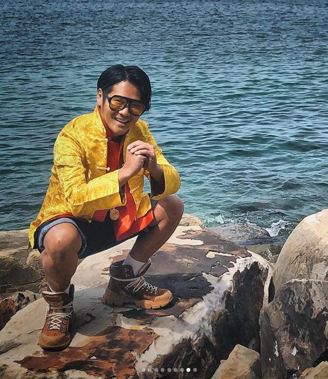 拍不成高级时尚大片,那么曹格还是走适合自己的接地气风格吧,只见他蹲在石头上,双手抱拳,面露笑意,很是喜庆。