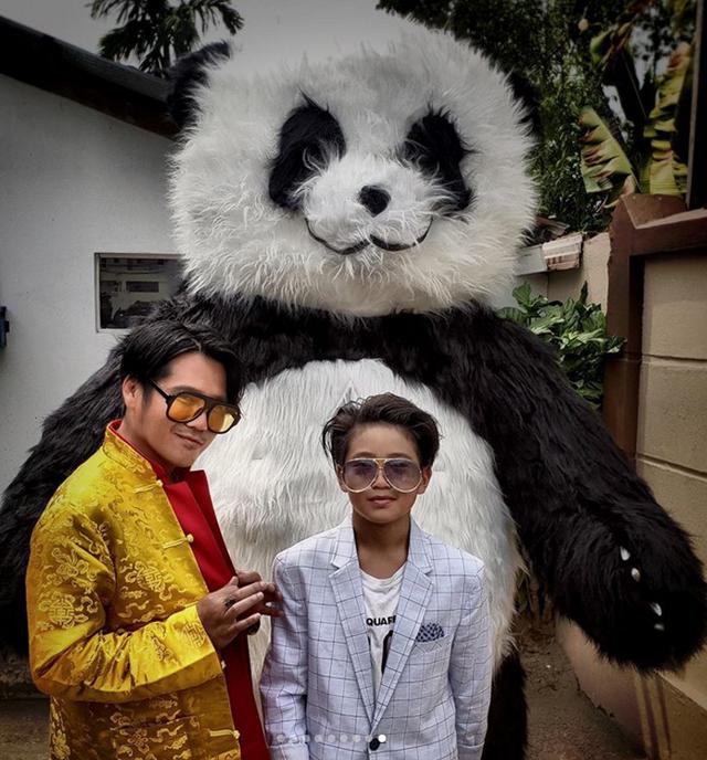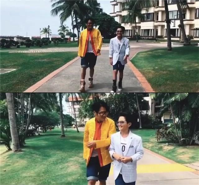 曹格和儿子Joe并肩走着模特步,曹格身穿黄色外套,身材微微发福,虽然走起路来气势十足,但是却难掩诙谐气质,很是有喜感。11岁的Joe身穿格纹西装搭配蓝色短裤,梳着大油头,墨镜加面,酷帅有型。