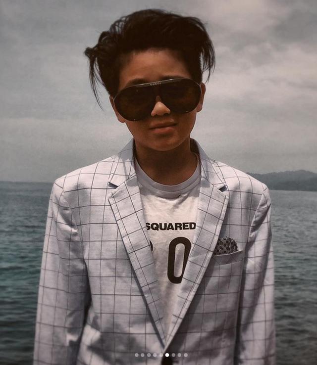 如果说在海边凹着造型拍照的Joe是个小型男,那么乖巧站着、露齿灿笑的他就是网友们所熟悉的可可爱爱的小男孩了,虽然穿得像个小大人,不过露出笑脸的Joe,尽显纯真稚气。