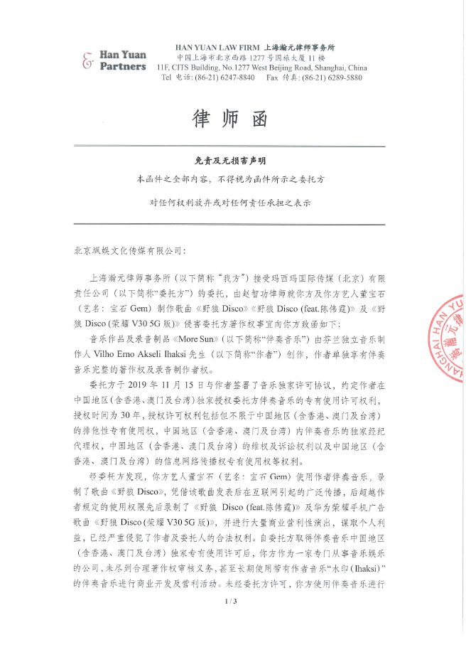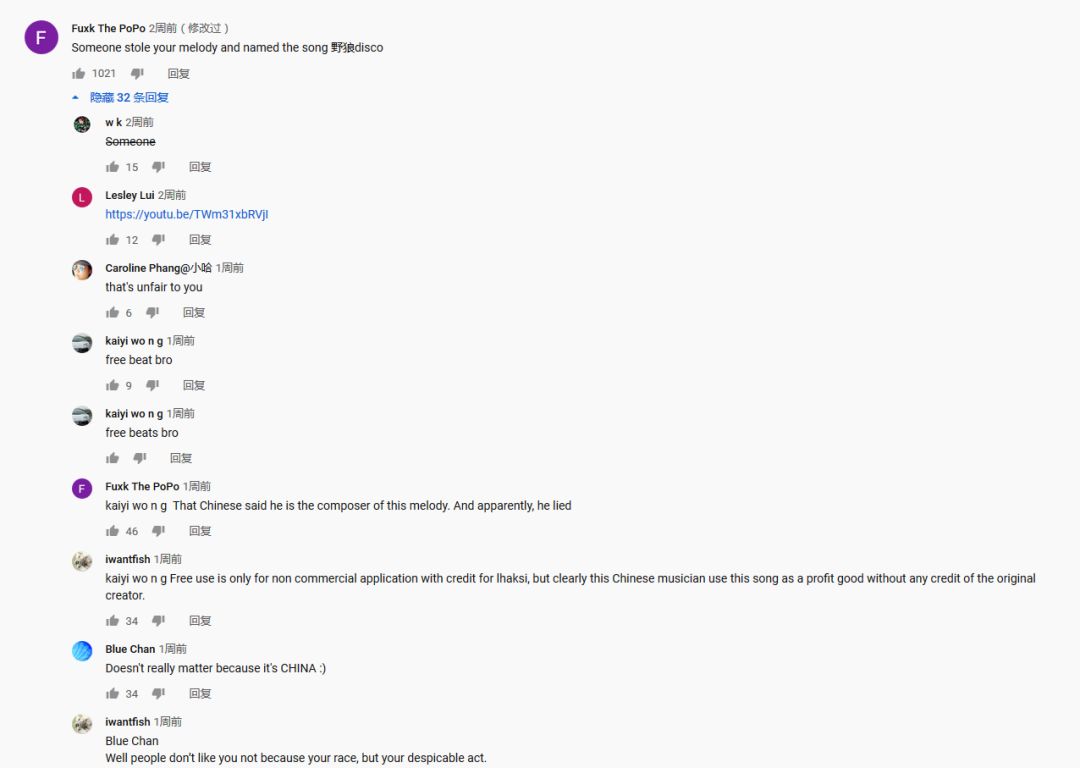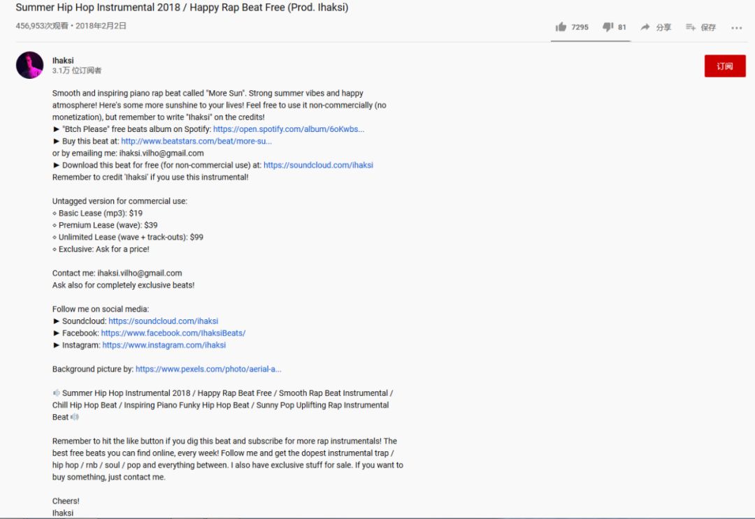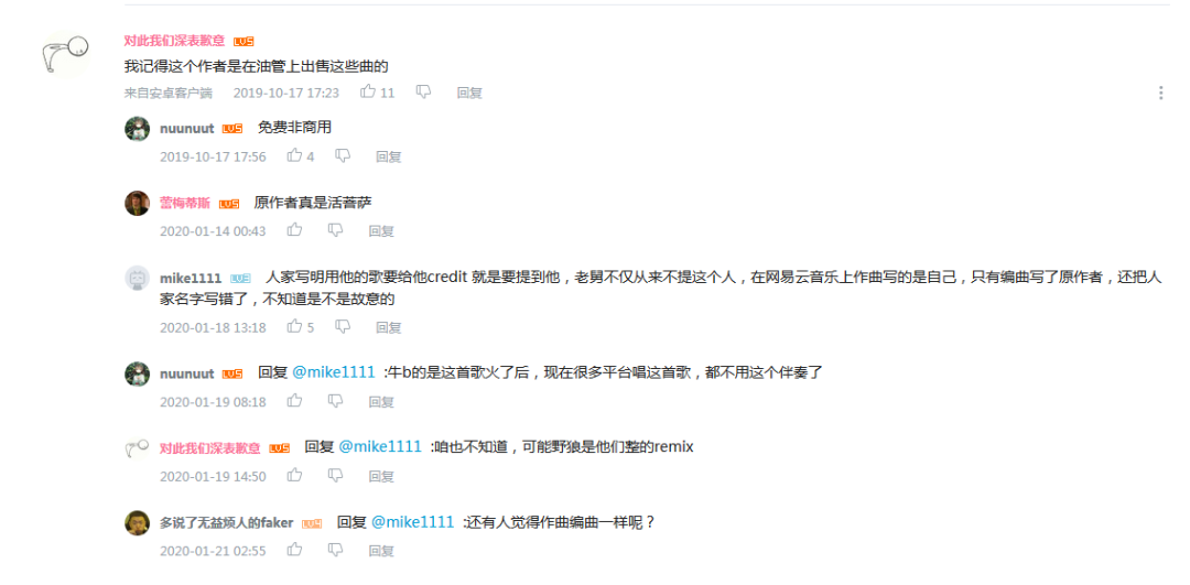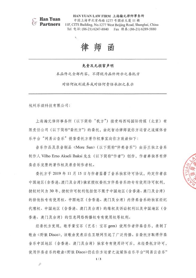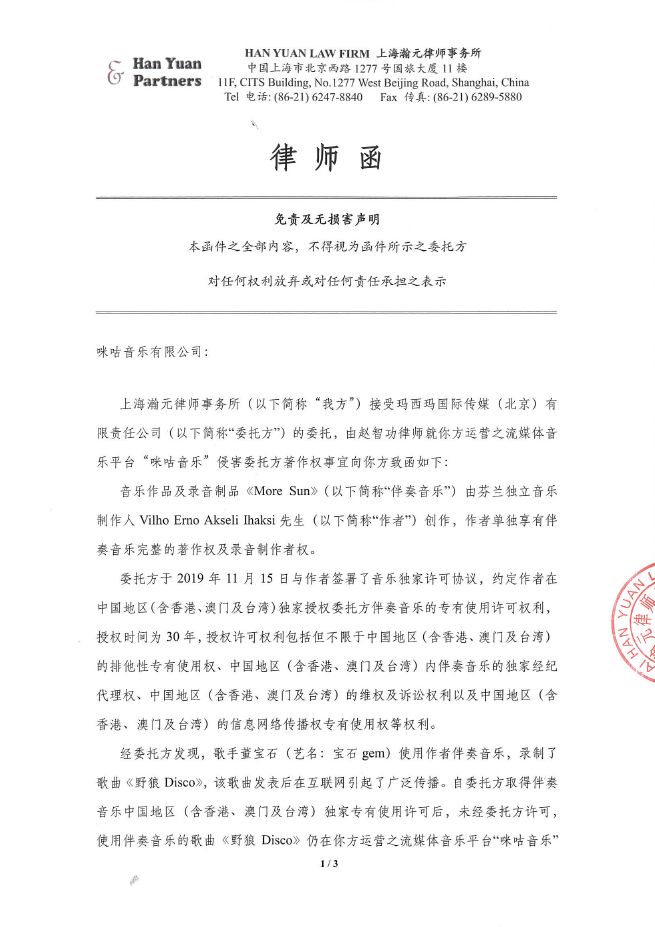《野狼Disco》到底侵权了吗? - 前 言 - 全国人民共克时艰,大家都度过了一个非常特殊,非常沉重的春节。 虽然全国疫情严重,央视春晚作为每年固定的传统项目,依然通过屏幕给大家带来娱乐和喜庆。 今年的春晚《过年Disco》表演大家都看了吗?宝石老舅成为了第一位登上春晚舞台的说唱歌手,对于宝石老舅来说是一件值得骄傲的事情,由衷替他开心,完成了一件具有历史意义的事情。 (图片来源于网络,仅供本文介绍、评论及说明某问题,适当引用) 老舅在春晚演出之后,发微博表示会将歌曲《野狼Disco》的全部版权收益捐赠给在武汉的医护人员家属,这样的胸怀,非常令人敬佩。 《野狼Disco》是一首带给大家很多欢乐的歌曲,野狼团队“飒娱”(宝石老舅的经纪公司)也在用实际行动给武汉带去支持,大家都有目共睹。 在很多年前,说唱还是在春晚相声中被调侃称为“rua普(Rap)”的新鲜事物,而如今,互联网就像一个放大转换器,通过网络的能量可以将个体的能量无限放大。歌曲《野狼Disco》正是如此,商业活动、晚会演出、酒吧蹦迪、公司年会、企业宣传片,甚至出门买瓶矿泉水在超市都可以听得到。 互联网帮助很多普通人完成了梦想,宝石老舅的成功,衷心为他祝福,并希望他越来越好,并期待他将来给大家带来更多的好音乐和欢乐。 但是随着《野狼Disco》在华语地区的火爆,一直都存在一些争议的声音,让这样一首欢乐的歌存在一些不欢乐的旋律。比如: 一些来自YouTube的评论(可以点击图片放大查看) 一些来自B站的评论(可以点击图片放大查看) 一些来自网易云的评论 一些来自自媒体文章和评论 那么上面提到的Ihaksi是谁? 上面一直提到的“Beat”是什么意思? 《野狼Disco》到底有没有抄袭呢? 不要急,马上就会让大家搞清楚。 - 分 析 - 《野狼Disco》是一首流行说唱歌曲。从歌曲(song)的完整组成上,分为词、曲和Beat(伴奏)三个组成部分。 说唱歌词,也就是Verse主歌部分,属于宝石老舅的创作。 旋律作曲,也就是Hook副歌部分,属于宝石老舅的创作。 Beat,也就是歌曲的伴奏,并非宝石老舅本人或他的团队原创,也不是邀请国内的音乐制作人制作人或Beatmaker量身定制制作的,《野狼Disco》的伴奏(Beat)使用的是芬兰音乐制作人Vilho Ihaksi制作的作品。 那么《野狼Disco》的Beat是哪里来的呢,宝石老舅跟这位芬兰音乐制作人很熟吗? 好像并不是。 《野狼Disco》的Beat的名称叫做《More Sun》,是芬兰音乐制作人Vilho Ihaksi的作品。 《More Sun》最早发表于2018年2月,远远早于2019年火爆大江南北的《野狼Disco》。 与传统流行音乐不同,说唱音乐的制作流程(workflow)上与传统音乐制作存在一些区别。 较为传统的流行音乐的创作,是先词曲,后编曲。 一般是通过一个旋律,发展出和声、结构和整体的音乐。 或者是通过词,发展出旋律,然后发展出和声、结构和整体的音乐。 编曲是指根据词曲进行和声、音色或配乐制作,最终进录音棚录制,才是我们听到的作品。 如果没有编曲,那歌曲就是清唱了。 总结一下:流行音乐的创作是先有歌,后配伴奏,最后录音变成成品。 而说唱音乐因为历史原因较为特殊(感兴趣的朋友可以参见我之前的文章:说唱、采样与法律 (威力加强版,已更新E-mu SP-1200)有详细介绍,为了节约大家时间,本文中就不展开了),Beat(也就是Hip-Hop音乐里的伴奏)是说唱音乐的创作动机。 说唱歌手在听到Beat后才开始创作。(当然因为说唱一般来说没有旋律性,说唱歌手可以把老的说唱的词放到新的Beat上面演唱,但是这种比较“耍小聪明”的投机行为,一般被称为“套词”,一经发现,是会受到鄙视和抨击的) 了解一些Hip-Hop文化,包括说唱和DJ的朋友很少会把Beat叫做音乐伴奏,因为Beat并不是为了“伴奏”某首歌,Beat就是Beat,是一种独立特定的存在。 总结一下:说唱歌曲中,Beat是创作非常重要的部分,先制作Beat,后写词,最后录音变成成品。 著名的视频《When RAPPERS Hear New Beats...Rick Ross, Pharrell, Jay Z, Timbaland, Busta Rhymes》,很清楚地记录了很多著名rapper们听到Beat的第一反应。 Jay-Z听到Kanye West的Beat的反映,就可以知道一个Beat对于说唱歌手的创作有多么重要。 Whuuuuuuut........This is dope!!!! Oh man! Kanye的Beat太美妙了!我是在天堂吗? 当然在现实中,不可能所有人都有机会让Kanye单独给你定制一个Beat。 随着互联网的发展,Beat已经变成了一种商品,销售的内容就是版权授权。 Beat可以租赁,也就是向Beat的音乐制作人支付一定的费用后,通常是明码标价,几美金到100美金不等,就可以拿来录歌。 这也是之前很多自媒体朋友之前提到《野狼Disco》抄袭意大利歌手SPOLPA的《DIMMI》的判断,这并不是抄袭,而大家用了同一个Beat。 那么,Beat的制作者难道都是音乐活菩萨吗,自己辛辛苦苦制作的音乐作品,以免费或者以极低的费用给大家用?并不是,比如说99元美金的授权就非常有限,只能用于非商业使用,严格禁止电视、广告和商业演出。如果想要取得这些权限,需要花更多价格购买新的授权。 总结一下,Beat拿来自娱自乐一下是可以的,只能用于non-profit和non-commerical的场合;但是要以明星艺人的角度进行营利性演出,是绝对禁止的,需要获得更高级别的授权。 让我们看一下Ihaksi的99美金的授权合同。 99美元的合同明显可以看到,所有营利表演性质,综艺节目,演唱会都是禁止的,原则上禁止大型商业营利性的使用。 这时大家也许会有一个疑