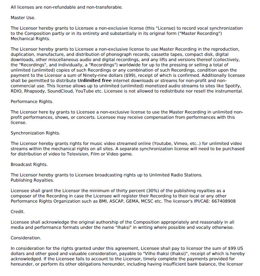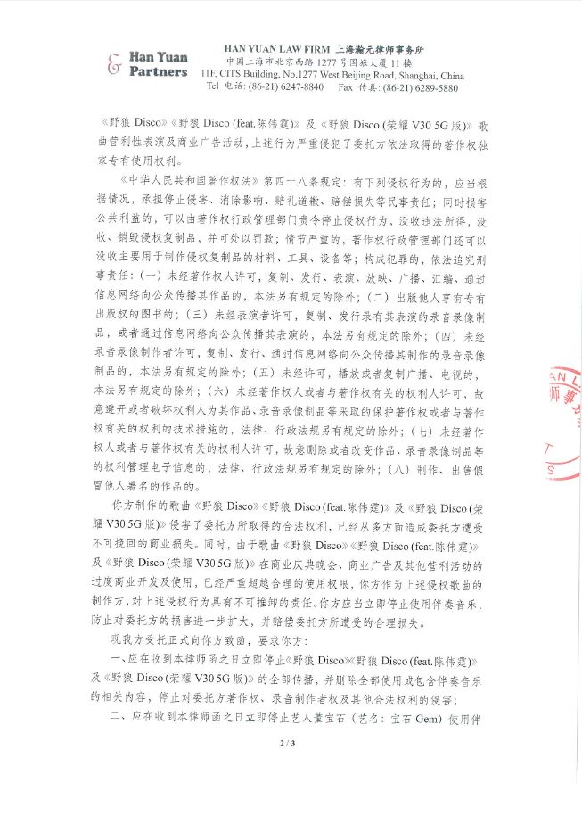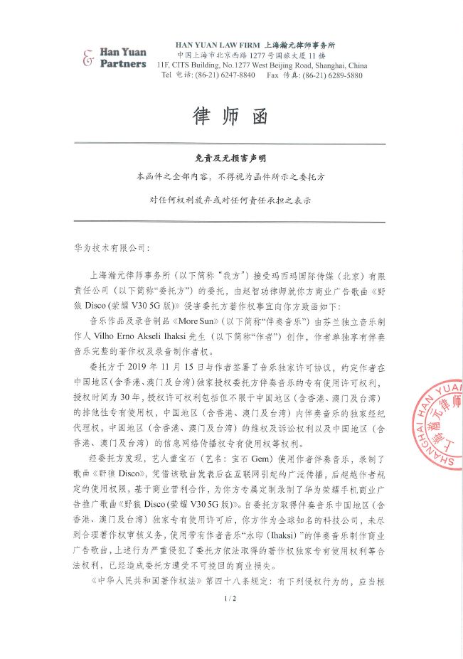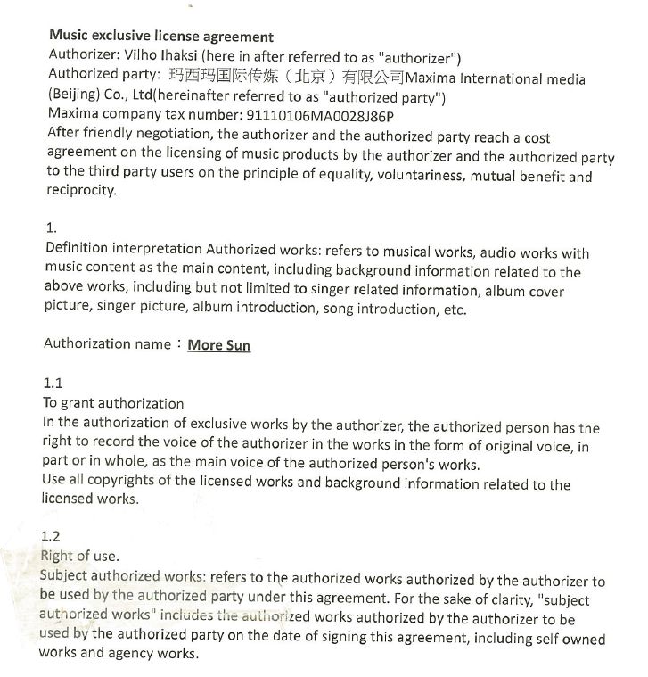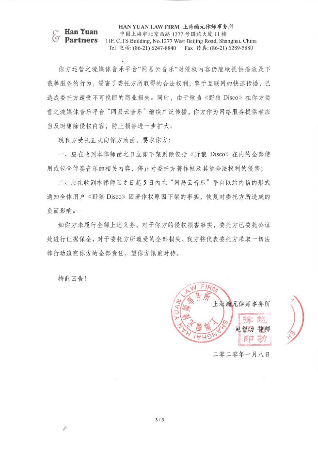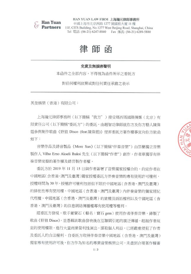 《野狼Disco》到底侵权了吗? - 前 言 - 全国人民共克时艰,大家都度过了一个非常特殊,非常沉重的春节。 虽然全国疫情严重,央视春晚作为每年固定的传统项目,依然通过屏幕给大家带来娱乐和喜庆。 今年的春晚《过年Disco》表演大家都看了吗?宝石老舅成为了第一位登上春晚舞台的说唱歌手,对于宝石老舅来说是一件值得骄傲的事情,由衷替他开心,完成了一件具有历史意义的事情。 (图片来源于网络,仅供本文介绍、评论及说明某问题,适当引用) 老舅在春晚演出之后,发微博表示会将歌曲《野狼Disco》的全部版权收益捐赠给在武汉的医护人员家属,这样的胸怀,非常令人敬佩。 《野狼Disco》是一首带给大家很多欢乐的歌曲,野狼团队“飒娱”(宝石老舅的经纪公司)也在用实际行动给武汉带去支持,大家都有目共睹。 在很多年前,说唱还是在春晚相声中被调侃称为“rua普(Rap)”的新鲜事物,而如今,互联网就像一个放大转换器,通过网络的能量可以将个体的能量无限放大。歌曲《野狼Disco》正是如此,商业活动、晚会演出、酒吧蹦迪、公司年会、企业宣传片,甚至出门买瓶矿泉水在超市都可以听得到。 互联网帮助很多普通人完成了梦想,宝石老舅的成功,衷心为他祝福,并希望他越来越好,并期待他将来给大家带来更多的好音乐和欢乐。 但是随着《野狼Disco》在华语地区的火爆,一直都存在一些争议的声音,让这样一首欢乐的歌存在一些不欢乐的旋律。比如: 一些来自YouTube的评论(可以点击图片放大查看) 一些来自B站的评论(可以点击图片放大查看) 一些来自网易云的评论 一些来自自媒体文章和评论 那么上面提到的Ihaksi是谁? 上面一直提到的“Beat”是什么意思? 《野狼Disco》到底有没有抄袭呢? 不要急,马上就会让大家搞清楚。 - 分 析 - 《野狼Disco》是一首流行说唱歌曲。从歌曲(song)的完整组成上,分为词、曲和Beat(伴奏)三个组成部分。 说唱歌词,也就是Verse主歌部分,属于宝石老舅的创作。 旋律作曲,也就是Hook副歌部分,属于宝石老舅的创作。 Beat,也就是歌曲的伴奏,并非宝石老舅本人或他的团队原创,也不是邀请国内的音乐制作人制作人或Beatmaker量身定制制作的,《野狼Disco》的伴奏(Beat)使用的是芬兰音乐制作人Vilho Ihaksi制作的作品。 那么《野狼Disco》的Beat是哪里来的呢,宝石老舅跟这位芬兰音乐制作人很熟吗? 好像并不是。 《野狼Disco》的Beat的名称叫做《More Sun》,是芬兰音乐制作人Vilho Ihaksi的作品。 《More Sun》最早发表于2018年2月,远远早于2019年火爆大江南北的《野狼Disco》。 与传统流行音乐不同,说唱音乐的制作流程(workflow)上与传统音乐制作存在一些区别。 较为传统的流行音乐的创作,是先词曲,后编曲。 一般是通过一个旋律,发展出和声、结构和整体的音乐。 或者是通过词,发展出旋律,然后发展出和声、结构和整体的音乐。 编曲是指根据词曲进行和声、音色或配乐制作,最终进录音棚录制,才是我们听到的作品。 如果没有编曲,那歌曲就是清唱了。 总结一下:流行音乐的创作是先有歌,后配伴奏,最后录音变成成品。 而说唱音乐因为历史原因较为特殊(感兴趣的朋友可以参见我之前的文章:说唱、采样与法律 (威力加强版,已更新E-mu SP-1200)有详细介绍,为了节约大家时间,本文中就不展开了),Beat(也就是Hip-Hop音乐里的伴奏)是说唱音乐的创作动机。 说唱歌手在听到Beat后才开始创作。(当然因为说唱一般来说没有旋律性,说唱歌手可以把老的说唱的词放到新的Beat上面演唱,但是这种比较“耍小聪明”的投机行为,一般被称为“套词”,一经发现,是会受到鄙视和抨击的) 了解一些Hip-Hop文化,包括说唱和DJ的朋友很少会把Beat叫做音乐伴奏,因为Beat并不是为了“伴奏”某首歌,Beat就是Beat,是一种独立特定的存在。 总结一下:说唱歌曲中,Beat是创作非常重要的部分,先制作Beat,后写词,最后录音变成成品。 著名的视频《When RAPPERS Hear New Beats...Rick Ross, Pharrell, Jay Z, Timbaland, Busta Rhymes》,很清楚地记录了很多著名rapper们听到Beat的第一反应。 Jay-Z听到Kanye West的Beat的反映,就可以知道一个Beat对于说唱歌手的创作有多么重要。 Whuuuuuuut........This is dope!!!! Oh man! Kanye的Beat太美妙了!我是在天堂吗? 当然在现实中,不可能所有人都有机会让Kanye单独给你定制一个Beat。 随着互联网的发展,Beat已经变成了一种商品,销售的内容就是版权授权。 Beat可以租赁,也就是向Beat的音乐制作人支付一定的费用后,通常是明码标价,几美金到100美金不等,就可以拿来录歌。 这也是之前很多自媒体朋友之前提到《野狼Disco》抄袭意大利歌手SPOLPA的《DIMMI》的判断,这并不是抄袭,而大家用了同一个Beat。 那么,Beat的制作者难道都是音乐活菩萨吗,自己辛辛苦苦制作的音乐作品,以免费或者以极低的费用给大家用?并不是,比如说99元美金的授权就非常有限,只能用于非商业使用,严格禁止电视、广告和商业演出。如果想要取得这些权限,需要花更多价格购买新的授权。 总结一下,Beat拿来自娱自乐一下是可以的,只能用于non-profit和non-commerical的场合;但是要以明星艺人的角度进行营利性演出,是绝对禁止的,需要获得更高级别的授权。 让我们看一下Ihaksi的99美金的授权合同。 99美元的合同明显可以看到,所有营利表演性质,综艺节目,演唱会都是禁止的,原则上禁止大型商业营利性的使用。 这时大家也许会有一个疑