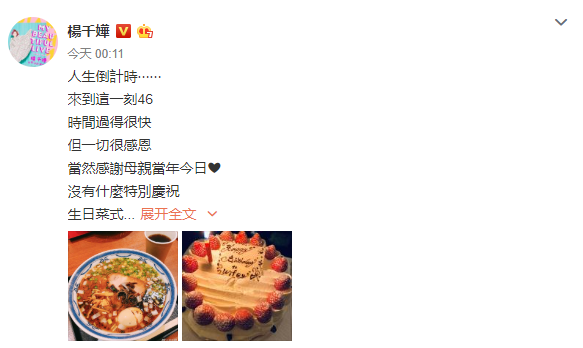 杨千嬅称:“来到这一刻46,时间过得很快,但一切很感恩,当然感谢母亲当年今日。沒有什么特別庆祝,生日菜式,就來一碗平常不敢吃的高卡熱拉麵、一杯熱茶,和大小丁一起吃著,原來過得很快樂,簡簡單單一輩子。”同时她表示生日愿望是世界和平,大家一切平安,“齊心抗疫,堅信一切會變好的”。