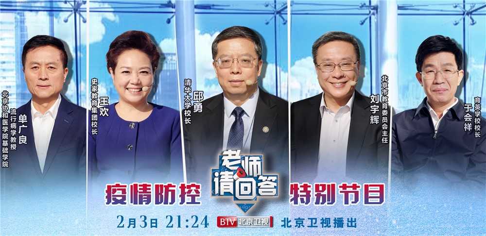 疫情爆发后,为了孩子的健康,北京市大中小学延期开学。究竟什么时候才能正式开学?湖北籍大学生无法返京怎么办?假期变长,学期变短学习内容学不完怎么办?寒假作业是否会增加?2020年的艺考、中考、高考在政策上会有什么样的调整和改变?面对疫情,全国最有影响力的教育节目《老师请回答》重磅推出《老师请回答——疫情防控特别节目》,就当前学生、家长最关心的几十个问题,邀请北京市教育委员会主任刘宇辉、清华大学校长邱勇、育英学校校长于会祥、史家教育集团校长王欢以及北京协和医学院基础学院、流行病学教授单广良,为您解读最新教育政策,指导最有效的家庭教育方式,独家揭秘清华大学录取秘笈和高考重点! 《老师请回答——疫情防控特别节目》干货满满,知识点十足,堪称“家有儿女”的必看节目! 《老师请回答——疫情防控特别节目》将从2月3日起每周一和每周二21:24连续两天在北京卫视播出,敬请关
