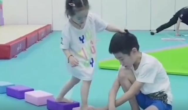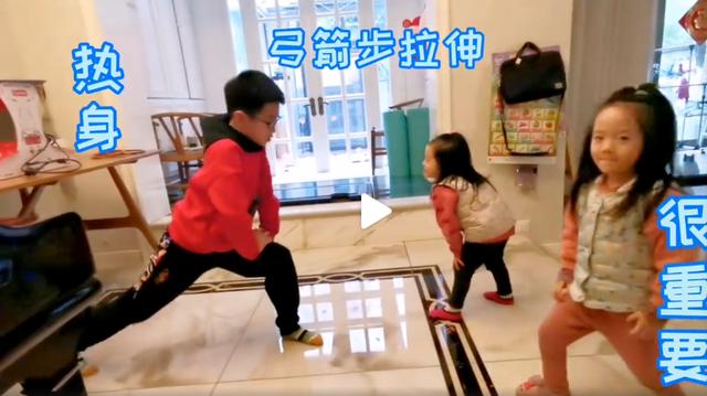 视频中,杨阳洋站在两个妹妹前方,给妹妹们做着活动肩颈、胳膊等比较简单的热身运动,而两个妹妹则乖巧地站在哥哥身后,有模有样地学着哥哥的动作。