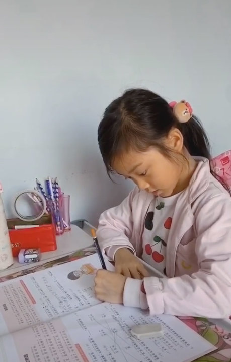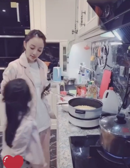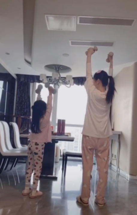几张照片中,甜馨和其他放假的小朋友一样,在家写作业、练琴、练舞蹈、做运动,另外母女还一起做饭,画面温馨。