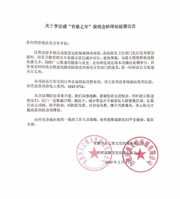 2月3日,李宗盛巡回演唱会蚌埠站主办方安徽华人之歌发布延期公告,原定于2020年3月27日举行的李宗盛“有歌之年”蚌埠站演唱会将延期举行,该场次演出已售门票延期后仍然有效,后续详情锁定主办方。