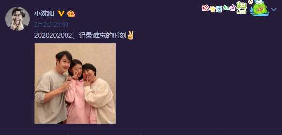 2月2日晚,小沈阳晒出一家三口全家福,并配文写道:“2020202002、记录难忘的时刻。”照片中,小沈阳一家三口头贴头对镜比着剪刀手,非常幸福甜蜜,女儿个头已经高过妈妈,也越来越漂亮,十足大美女一枚。