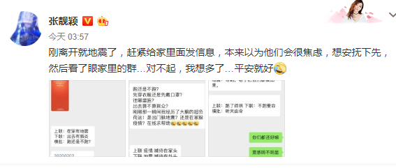 张靓颖称:“刚离开就地震了,赶紧给家里面发信息,本来以为他们会很焦虑,想安抚下先,然后看了眼家里的群…对不起,我想多了…平安就好”。聊天截图中家人面对地震反应淡定乐观,张靓颖表示“平安就好”。