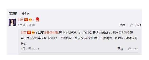值得一提的是,对于李小璐,马苏还只是玩了一把文字游戏,借吐槽节目将李小璐冷嘲热讽一番,最决绝的恐怕是刘芸,因为在“夜宿门”事件曝光后,她居然公开发文撇清与泰迪姐妹团的关系,甚至还影射泰迪姐妹团整容“我不是泰迪姐妹团的,我不养狗也不整容,我只是多年前帮甘薇拍了一个网络剧,所以也认识她们而已!”
