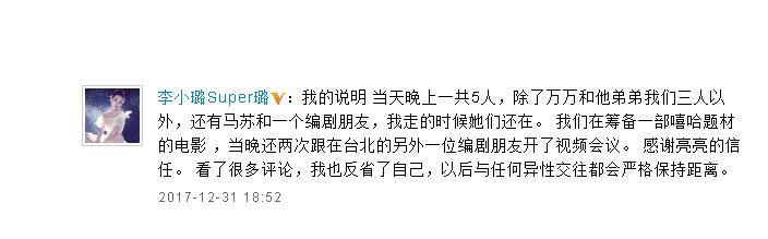 李小璐当时澄清只是到PGONE家里洽谈一部关于嘻哈题材电影,而且好姐妹马苏和一位圈内编剧也在场,迫于无奈,马苏跑出来澄清,然而她发给贾乃亮的微信却说当天他们在一起看电影,同行是不是编剧,而是一位导演。