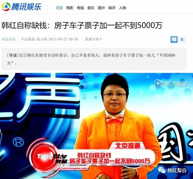 韩红2013年谈过自己的身家:全部加一起5000万。 这个数字,还不到流量小花一部戏的片酬。