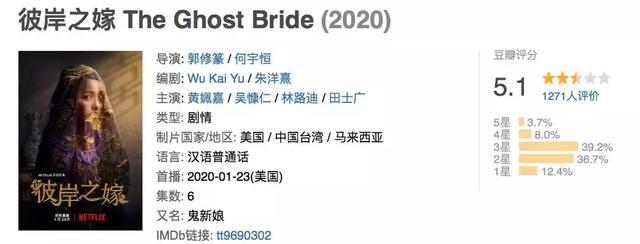 好像是算着春节假期,他们的最新华语剧《彼岸之嫁》在前些天一次性放出了全部6集。豆瓣开分不及格,这两天更是一路跌到了5.1分。