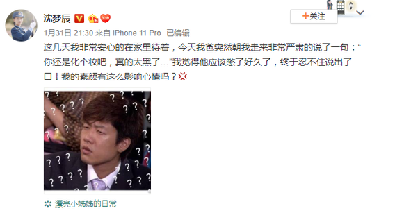 1月31日,沈梦辰更新社交动态透露宅在家的状态,称素颜状态被沈爸爸嫌弃“太黑了”,她无奈表示“我的素颜有这么影响心情吗?”
